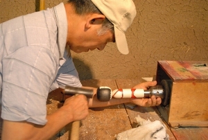 こけしの頭をハンマーで殴って機械にはめ込み、磨きます。