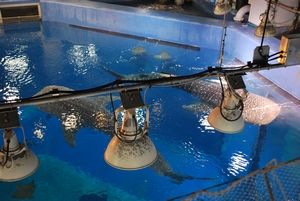 エサが放り込まれると、3匹いるジンベエザメが一斉に立ち泳ぎになり、この