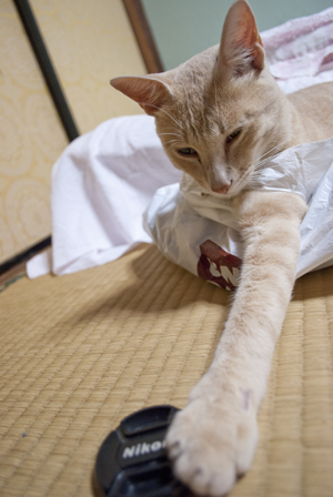 ユニクロの袋に入りながら、私のカメラのフタとじゃれてます。
